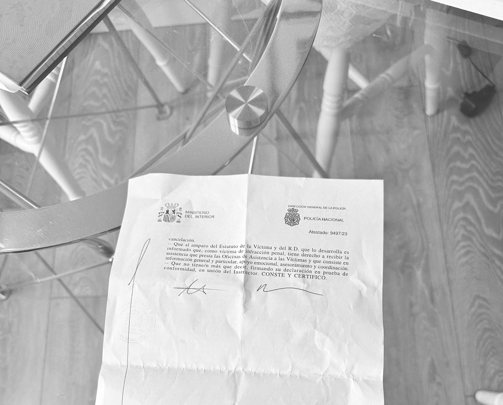 The policeman raised his eyes for a moment before continuing to write out my missing report. I, meanwhile, tried to rub out the black splodges around my eyes and did my best to smile at the tanned Spanish man in the tight blue uniform.