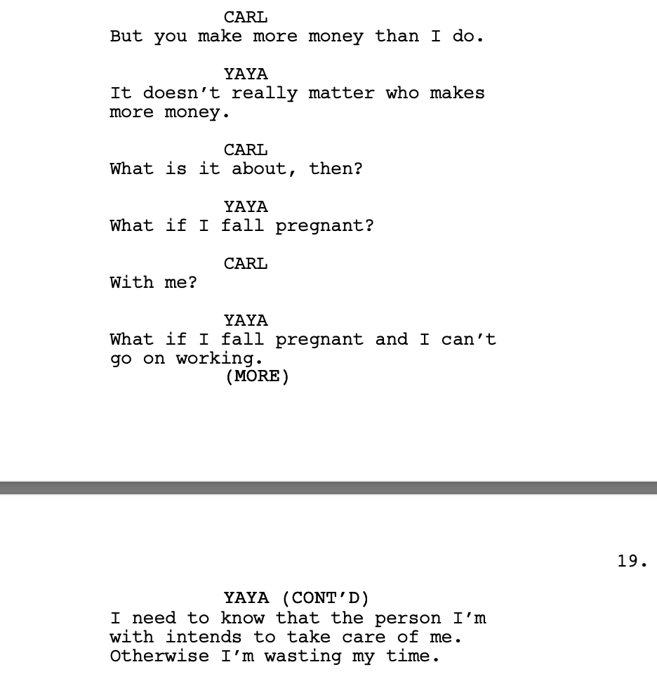 There is a scene in Triangle of Sadness where the boyfriend (Carl) is fighting with his girlfriend (Yaya), because he has had enough of her expecting him to pay. In the scene below she is justifying her actions.
