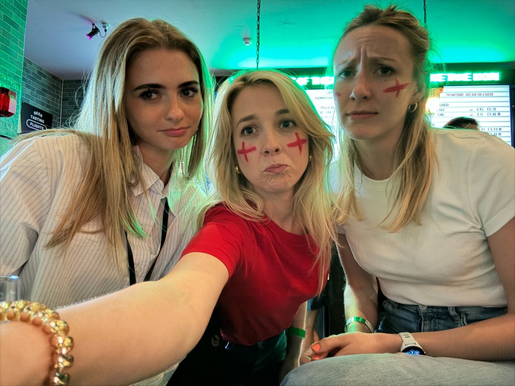 The girlfriend was wearing multicoloured bracelets and had painted flowers on her toenails. She took out her red lipstick and drew St George’s flags on everyone’s cheeks – even the Texan allowed her to put our flag on his face. When we said it was her turn, she said,