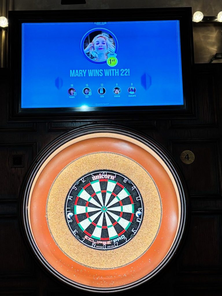 Two frollegues, had matching ‘Let it Snow’ jumpers on. They were using the time to fill each other in on gossip but kept getting interrupted by the game. “Your turn, Josie! Jose!” Josie would swiftly throw the darts and return to the gossip circle.