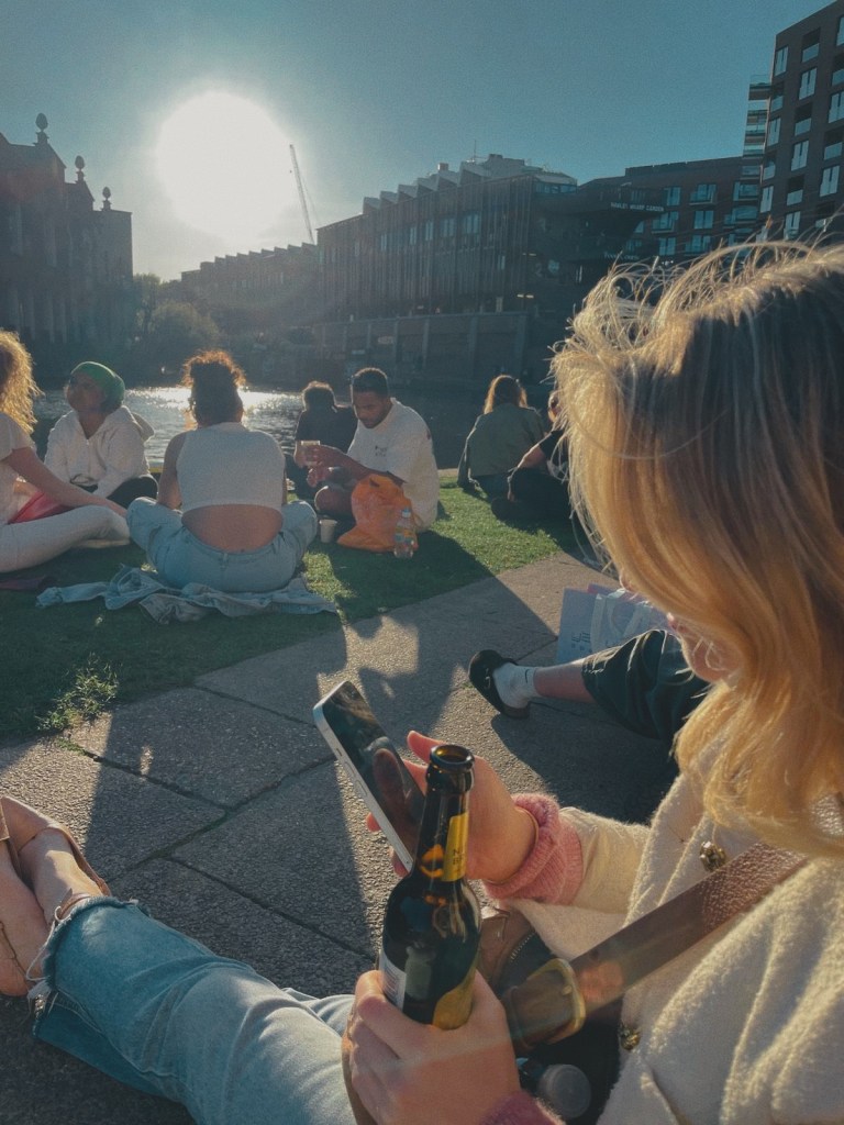 Tommy and I had arrived at Camden and were sipping beer by the canal, watching the sunset. Behind us, a group was dancing to a song I did not know. A man was videoing himself as he smoked a joint; he breathed out a cloud and smiled proudly at the camera. A couple was lying near us, sharing a bottle of wine with plastic cups. She was using his chest as a pillow, pointing out the clouds in the sky. I wondered if she enjoyed being in a couple on this fine day or had the opposite problem as me, and didn’t know how to be single.