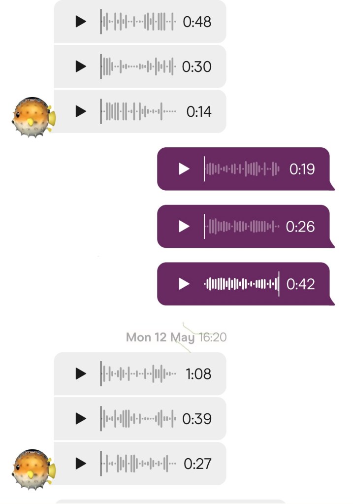 We began voice-noting almost instantly. He sounded like Colin Farrell, and this made me very happy indeed.