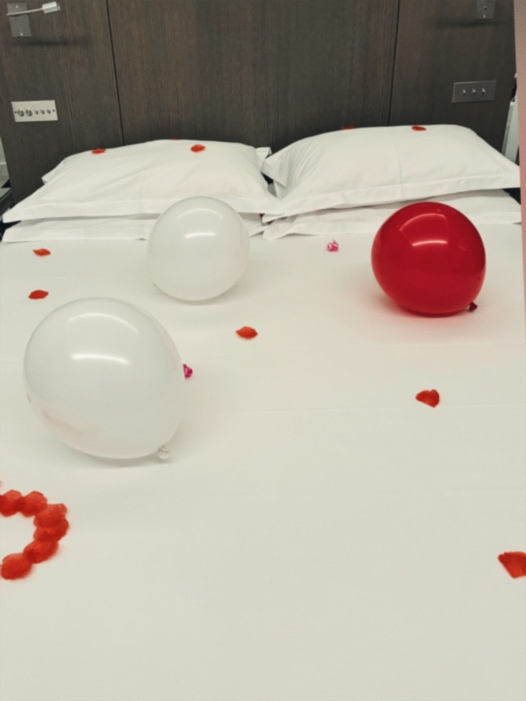 We got to our hotel late and barged into the room (not through sexual tension, more so because we are over 30 and tired). We paused in front of the bed, where there was a display of red and white balloons.